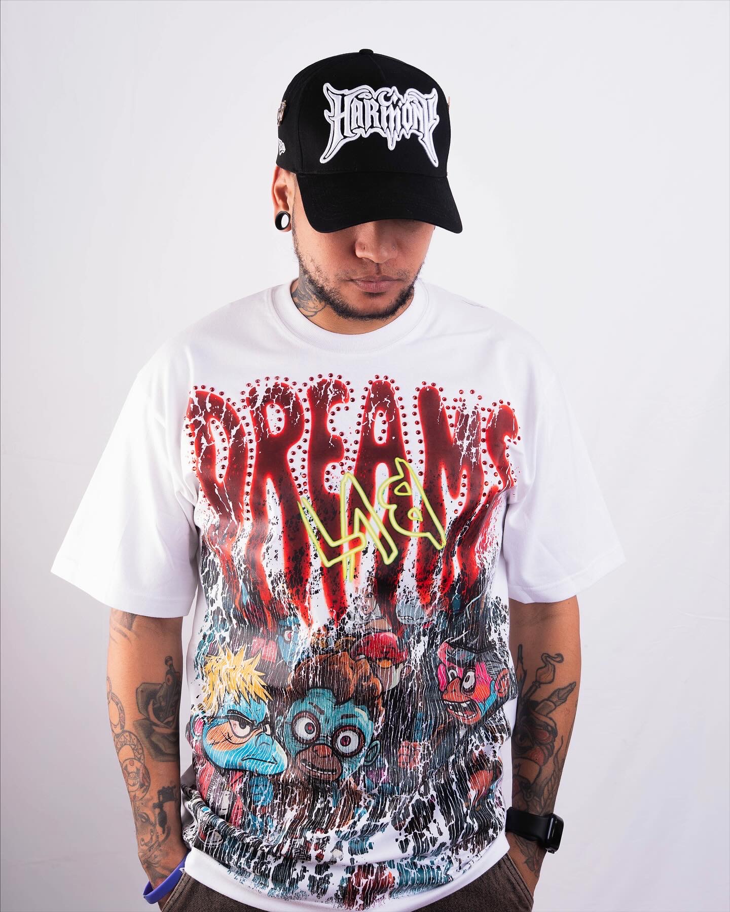 Step into the chaos of color and creativity with the “Visions” Graphic Tee from DreamsLAB. Crafted from 100% heavyweight cotton, this exclusive piece fuses street art and comic culture in a bold multicolor explosion. The front showcases a cracked-texture screen print with expressive characters and the signature “DreamsLAB” tag, channeling the raw energy of 90’s underground art. Oversized fit with dropped shoulders for a relaxed silhouette. Ribbed neckline for lasting structure. Available only in white and limited to 100 pieces worldwide — made for those who dream loud and live louder.
