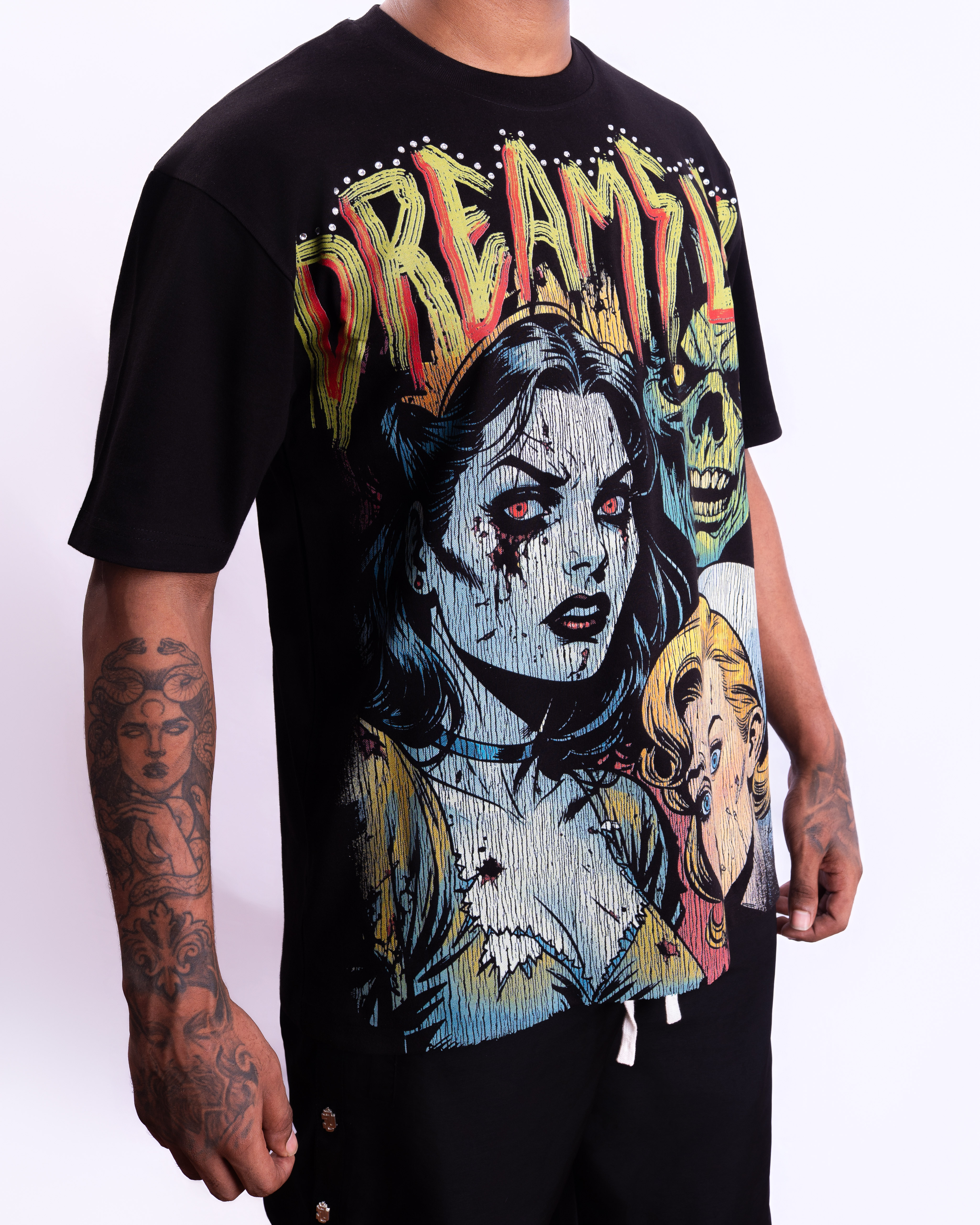 Step into the raw energy of the underground with the “Rebirth” Graphic Tee from DreamsLAB. Crafted from 100% heavyweight cotton, this piece features a distressed multicolor print inspired by 90’s horror comics and street art rebellion. Each graphic is individually screen-printed for a unique cracked texture effect. Oversized fit with dropped shoulders Ribbed neckline for lasting shape Signature “DreamsLAB” front artwork 100% premium cotton Made for those who turn chaos into art.